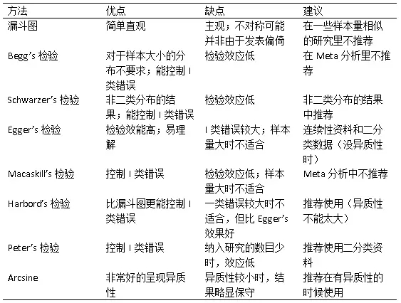 下面的这张表格直观的描述了各种发表偏倚检验方法的优缺点