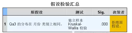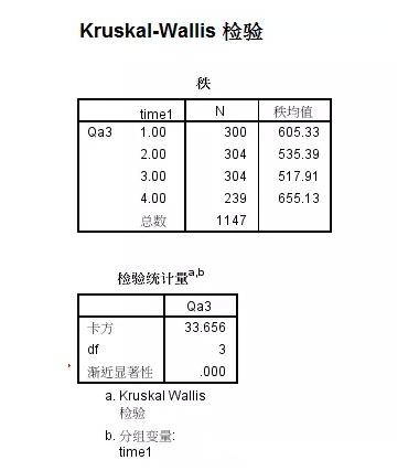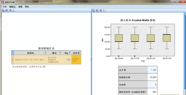 二、这里默认的是Kruskal-Wallis检验,即比较不同组间的分布。输出结果发现统计量为33.656,p<0.001,组间分布是有差异的。可惜的是,旧对话框不能提供两两比较的结果,也许正因为如此,旧对话框才成为旧对话框。