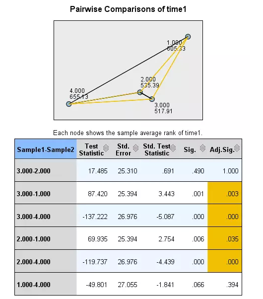 六、底栏“视图”有不同的选择,默认为独立样本测试视图。“视图”选择成对比较,即出现两两比较的结果。这里第1列Sample1、Sample2的1、2、3、4是对应您分组的顺序的,第4列Std.Test Statistic为检验统计量z,第6列Adj. Sig.为p值。可以看到1组和2组、1组和3组、2组和4组、3组和4组差异有统计学意义。