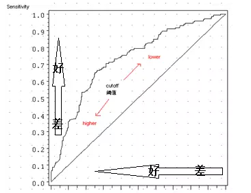 在一个诊断试验中,如果检验指标为连续变量,我们一般设定一个界值,高于界值即为阳性,低于界值为阴性。职血压高于140mmHg为阳性,低于等于140为阴性。而当一指标为非常新,没有公认的界值时,我们可以设定不同的值为界值,每个界值都可以得到一对灵敏度与特异度。我们以灵敏度为纵坐标,以1-特异度为横坐标作图,如下图,即为受试者工作特征曲线(receiver operating characteristiccurve,ROC曲线)。