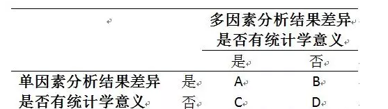 我们用下表表示单因素分析与多因素分析结果对比的可能结果: