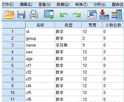 如下图,一个数据,包括了id(病例的唯一编码)、group(干预方法)、cf1-cf6(六个混杂因子)。
