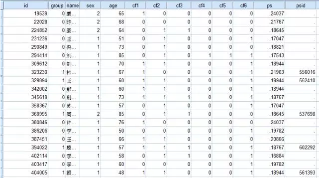 可以在下图中看到,在我们的变量后面多了两个新变量,ps即每个case的倾向得分,psid即匹配对象,第一个19539未能匹配,第八个323230匹配对象的id是556016,依次类推。