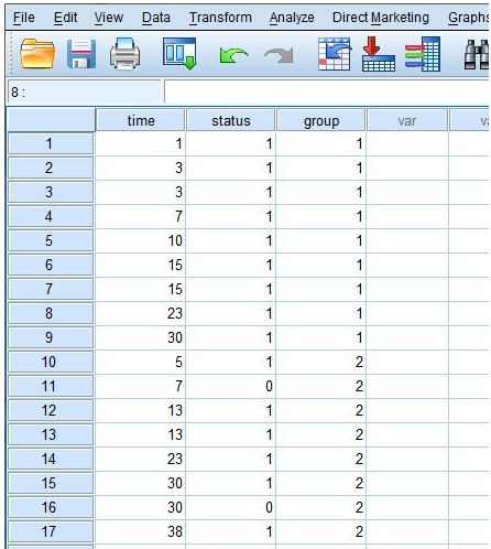 生存结局(status)分为“死亡”与删失两类,“死亡”是感兴趣的终点事件,其他终点事件或生存结局都归类为删失(censoring)(也称截尾或终检)。举例来说,如果要研究两种治疗组直肠癌患者预后的差异,研究的终点事件是因直肠癌死亡;那么,因车祸的死亡,心梗发生的死亡,存活,失访的患者的生存结局都是:删失。在生存分析的图中,删失数据都统一用“+”显示。