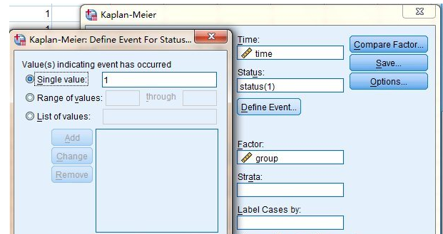 按图选入变量,点击Define Event右图所示,定义Single value:1(终点事件)。在Compare Factor可选择Log Rank对甲乙两组的生存曲线进行比较。在Options中Plots选择Survival,可得到生存曲线。