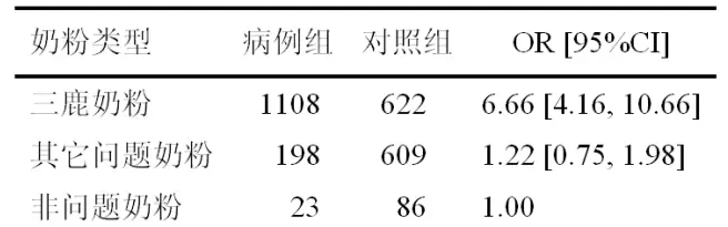 上表标题和“奶粉类型”的内容提示,这是关于“奶粉事件”研究的一部分,说明婴幼儿食用问题奶粉,尤其是三鹿奶粉,泌尿系结石发生风险的相关性。上表中提供了基础数据,并用OR作为风险关联的主要评价指标。依据上表提供的信息可以得出以下结论: