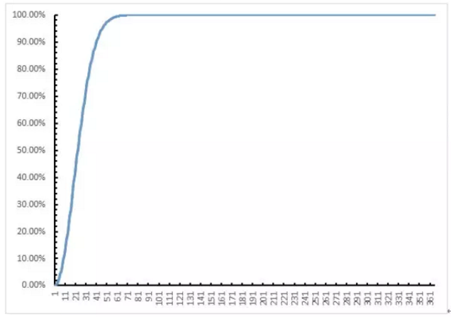 那我们不妨换一个思路,我们求这n个人中大家生日都不相同的个数,它等于365×364×363×……×(365-n+1)。为什么是这样呢?因为第1个人的生日有365个选择,第2人为了和第1个人生日不一样就只有364个选择了,依此类推。