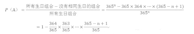 问题:假设有n个人参加聚会,其中至少有两个人生日相同的概率是多少呢(P(A))?(条件是一年有365天,每个人的生日随机发生在一年中的某一天。)