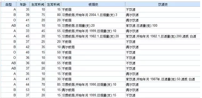 首先是我们的示例数据,变量分别是血型(1=A,2=B,3=O,4=AB)、年龄、左右耳听阈、吸烟史和饮酒史。