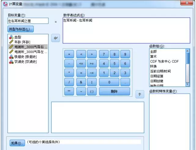 示例数据有左耳听阈、右耳听阈,若我们想看看左右耳听阈之差呢?也就是说,我们要根据现有的左右耳听阈,新生成一个左右耳听阈之差的变量。在SPSS工具栏中选择转换-计算变量,弹出对话框如下。首先需要定义新变量的名称,也就是图中的目标变量。在这里,我们定义为左右耳听阈之差。此外,我们可以选择类型和标签定义变量类型和标签。然后,在右侧文本框写出数字表达式,即可。当然,您也可以通过函数组和如果进行公式的书写和条件的设置。