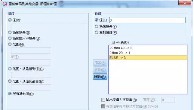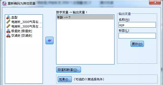将年龄选入中间的文本框,此外,需定义输出变量的名称。接下来,选择旧值和新值定义编码规则。比如,我们在旧值中写入0到29岁的范围,新值定义为1,点击添加,直到完成重新编码。返回到上图页面,点击更改。至于血型的重新编码,操作大体是一样的,您不妨亲身尝试一下。
