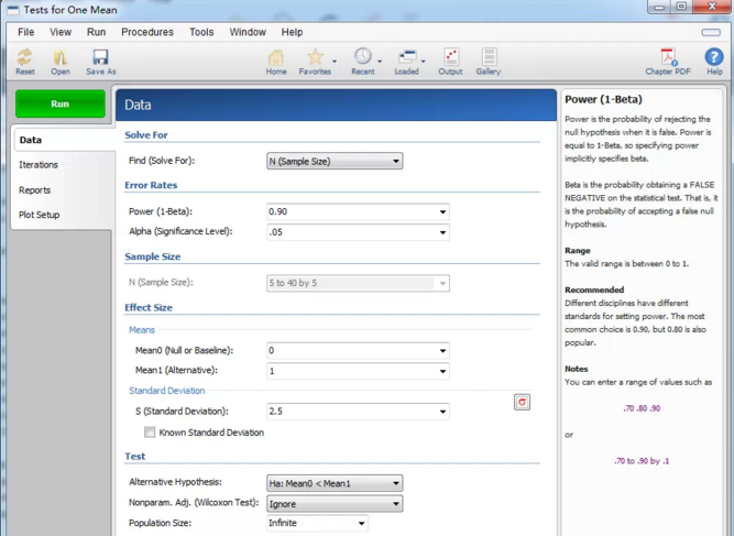 (3)在Means中的输入方法,如果已知允许误差delta,Mean0(Null Or Baseline)处输入0,Mean1(Alternative)处输入允许误差delta;如果知道总体的均值和单样本的均值,则在Mean0(Null Or Baseline)处输入总体的均值,Mean1(Alternative)处输入单样本的均值。