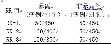 现在我们模型一个数据看看两个回归的结果。我们设定某病的基线患病率为10%,分别模拟RR=1,2,3的三个数据,总人数为1000,暴露组和非暴露组各500例。如下表。当RR=1时,暴露组和非暴露组各有50人患病。