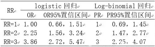 分别使用logistic回归和log-binomial回归进行统计分析,得到的结果如下表。