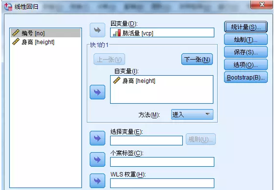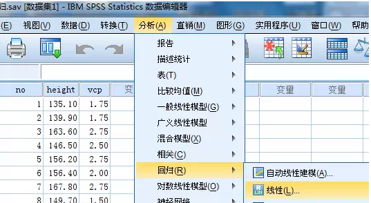 在SPSS菜单点击“分析”-“回归”-“线性”,在弹出的对话里将肺活量选入因变量,身高选入自变量,点击确定。