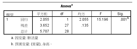 在第一个“模型汇总”表里,我们看到R、R方及调整R方,在简单线性回归模型时,这里的R相当于自变量与因变量的pearson相关系数;R方即前面R的平方,意义是有多大比例的因变量变异能被自变量解释,在这里即肺活量的36%的变量可以由身高解释(影响);调整R方在简单线性回归没有太多意义,在多重线性回归模型里,可以通过查看增加或减少某个自变量后调整R方的变化来决定是否在模型里保留某变量。