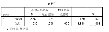 上表是我们会写进文章里的结果,非标准化β值即方程的系数,上表的方程模型可以写成vcp=0.032*height-2.758+ε,ε为随机误差项,即身高增加1cm,肺活量增加0.032;第三个数0.6是标准化系数,主要用于多个自变量时比较哪个自变量对因变量影响更大;第二个数0.008是非标准系数的标准误,根据其与非标准化系数可以计算t,根据t及自由度可以查表得出P值。