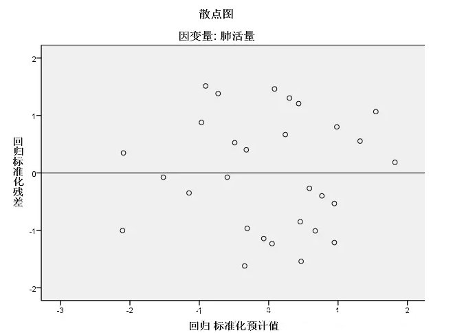 等方差:等方差不是指因变量或自变量方差相等,而是在因变量的每个预测值处,残差的方差相等。在SPSS里可以直接画残差与因变量预测值的散点图查看,如下图所示: