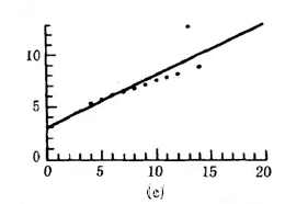 异常值或强影响点:即某一个或几个点可能会对线性关系影响很大,这一组(或几组)数往往是离群值,因此可以通过画因变量与自变量的散点图查看。本例子中散点图见前面的图,认为没有观察到强影响点。如下图可认为有强影响点,是否为异常值需要再查看数据或进行专业判断。