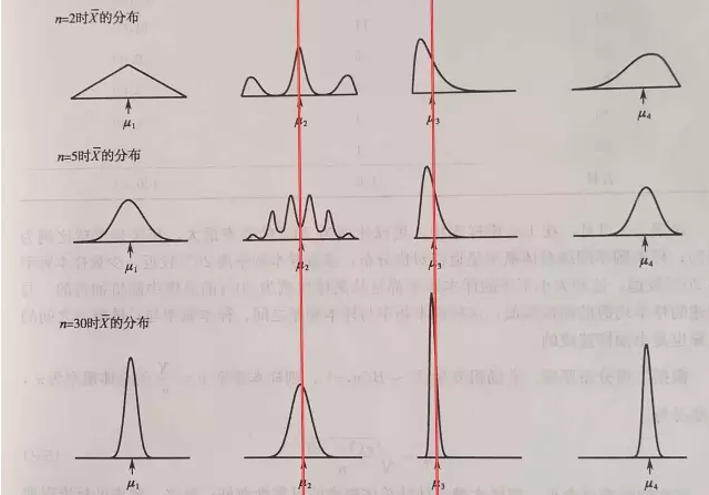 那么什么才叫大样本呢?有模拟显示每次抽样30例及以上,样本均数的分布就近似于正态分布。如下图(第1行为总体分布,第2行为n=2的均数分布,第3行为n=5的均数分布,第4行为n=30的均数分布):