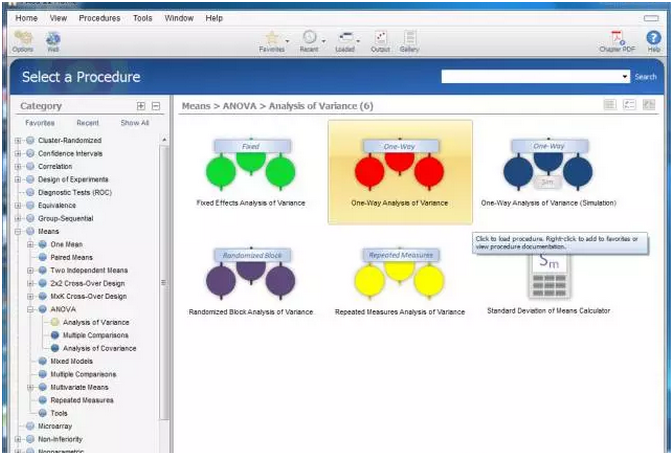 在PASS界面选择“Means---ANOVA---Analysis of Variance”,就是下图截图中那个火红火红的。