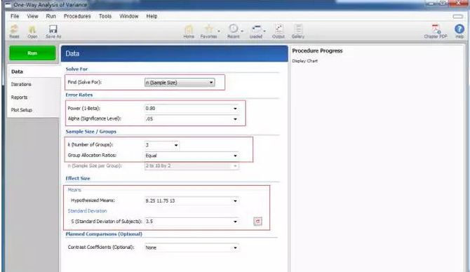 分别对u1和u2、u2和u3、u1和u3进行两样本均值比较的样本量估算,一定要注意α应是调整后的0.0167。还是以u1=8.25, u2=11.75, u3=13为例: