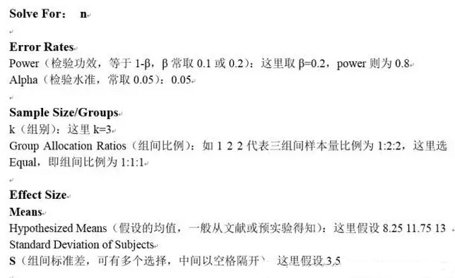 还记得此行是为了求取样本量n吧,在Solve For部分选择n。这时发现,还需要给定power、α、组别、组间比例、各组均值、标准差。
