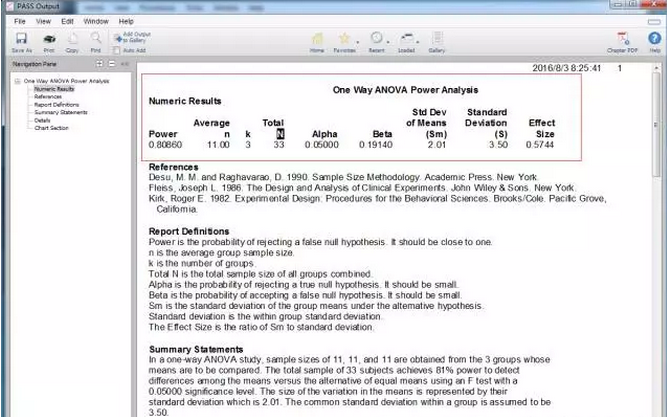 点击左上角的run即可跳转到样本量估算页面。可得知每组至少11例,共计33例。输出界面给出的有summary,可附在文章方法部分,另外给出的引文也可作为参考文献列入,以供编辑和读者查证。