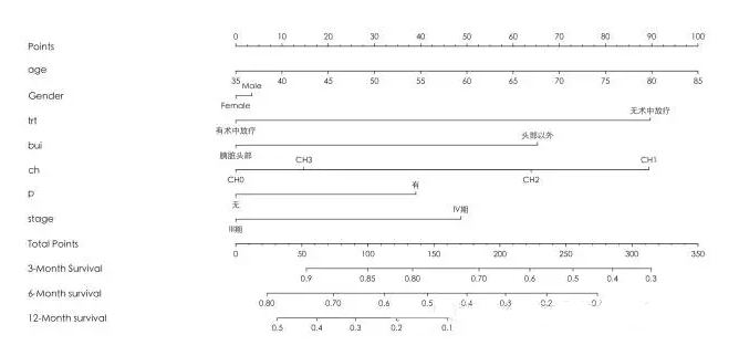 plot(nomogram(coxm,fun=list(surv1,surv2,surv3),lp= F,funlabel=c('3-Month Survival','6-Month survival','12-Month survival'),maxscale=100,fun.at=c('0.9','0.85','0.80','0.70','0.6','0.5','0.4','0.3','0.2','0.1')),xfrac=.45)